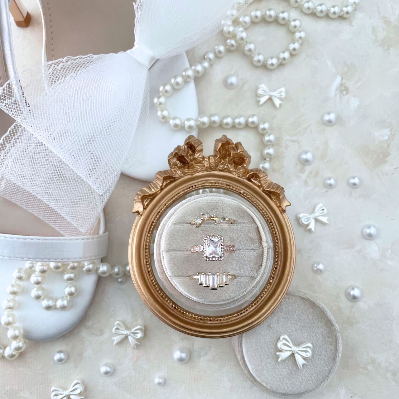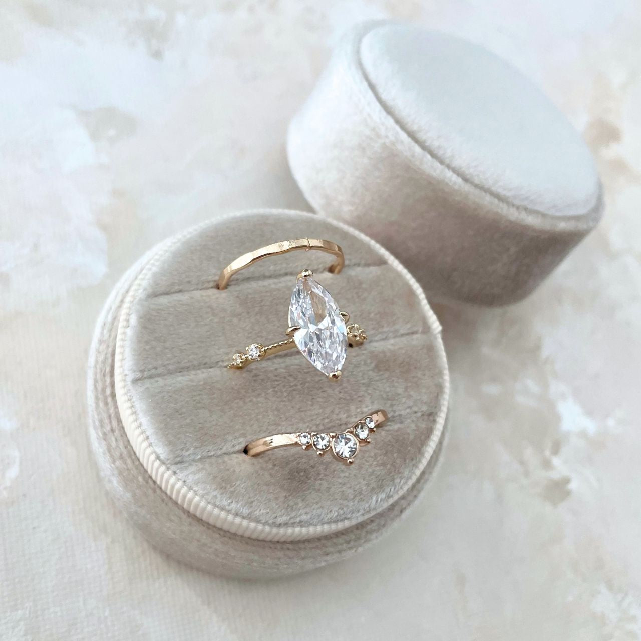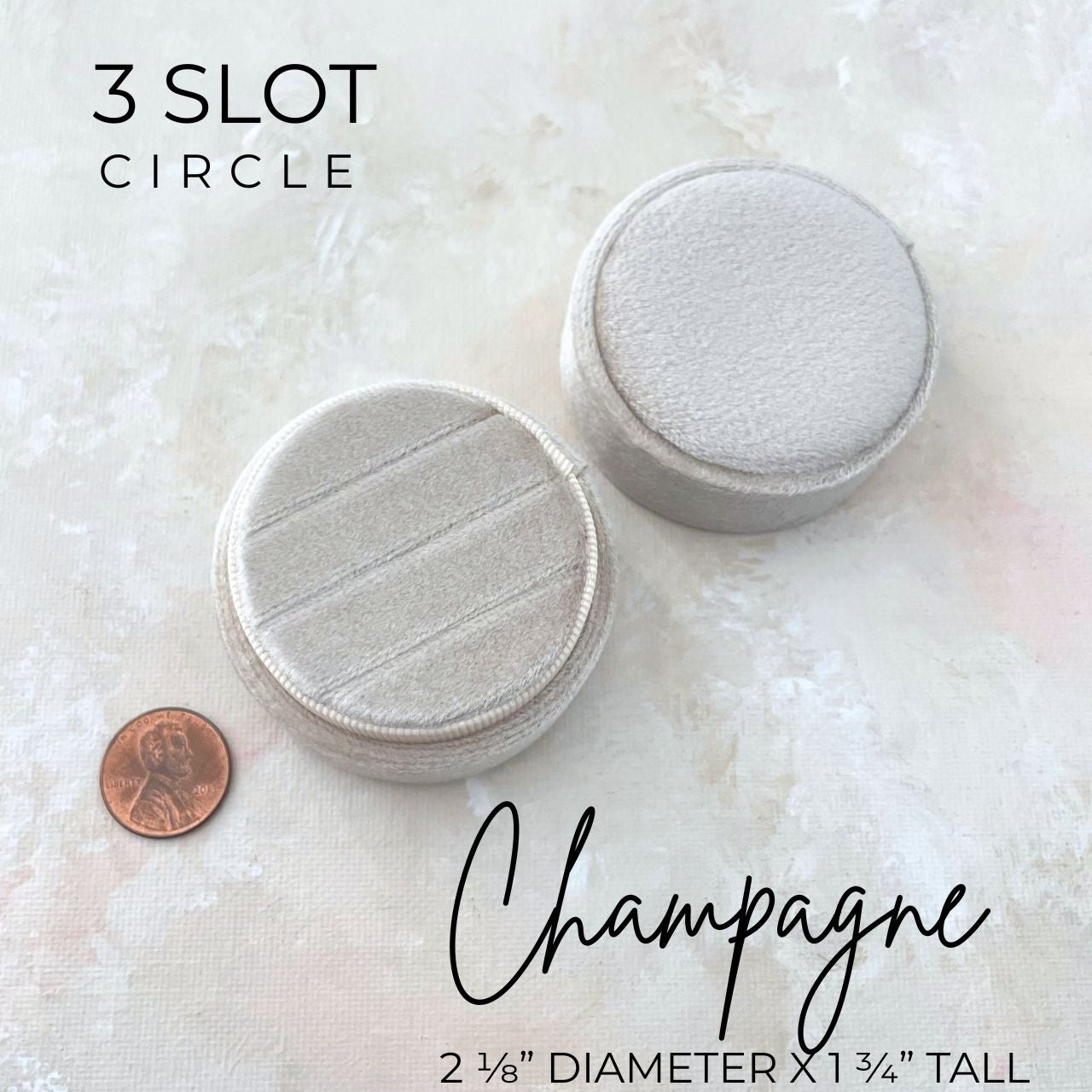 Perfect for your Wedding Day! Our Triple Ring Box will showcase all 3 rings brilliantly! From Ring Bearer to wedding ceremony, to flat lays this circle ring box will create magic. With its three slots & classic Champagne color, this ringbox is a must for your big day.