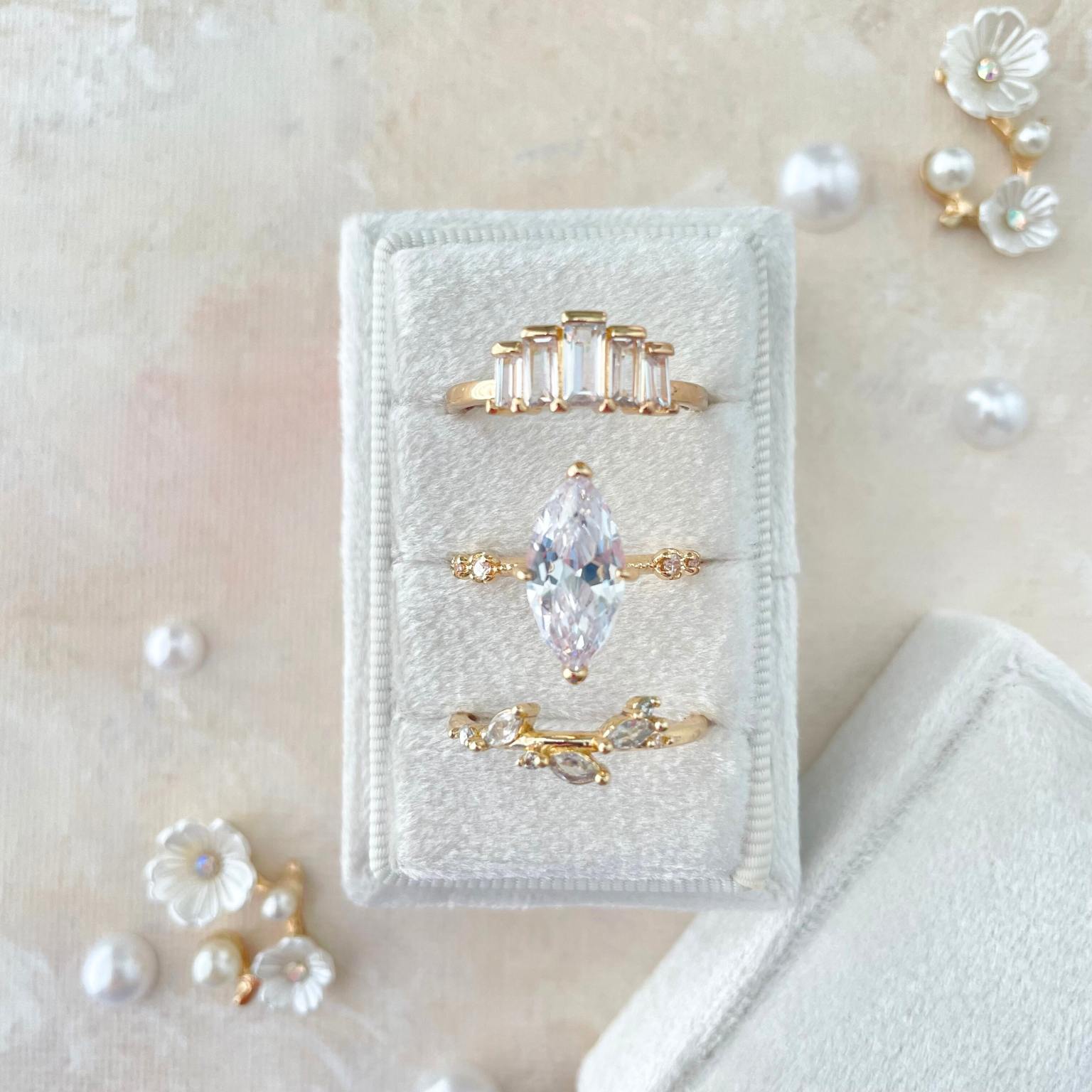 With its elegant reactance shape and 3 slots your wedding day detail photos will never be the same. The Velvet Ring Holder will showcase both bride and groom's rings.